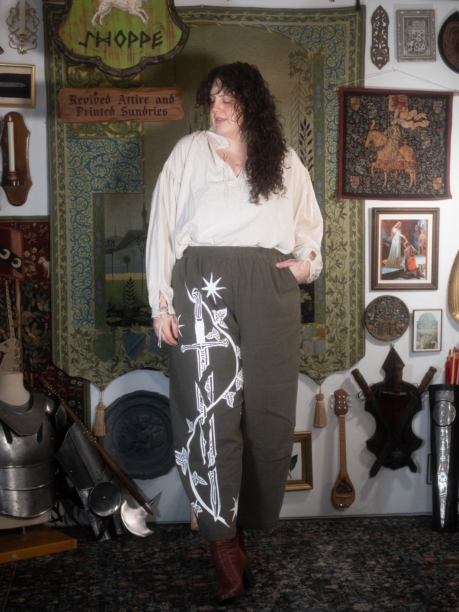 Step into castlecore style with these bold, barrel-leg pants featuring an exclusive screen-printed sword design. Made from 80% Ramie, a breathable natural fiber similar to linen, and 20% Cotton, these pants offer a flowy and comfortable fit for a striking silhouette.