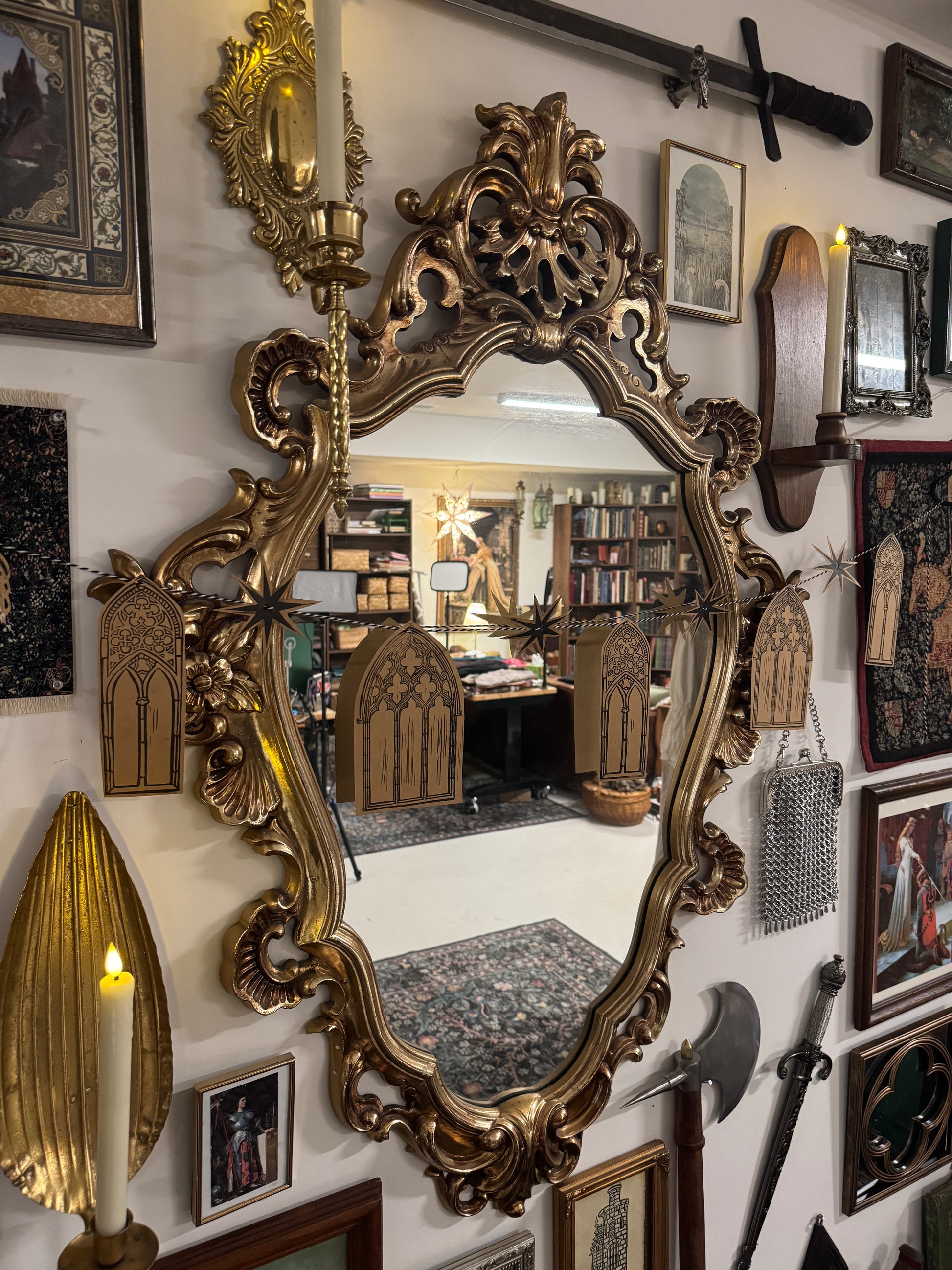 Bring a touch of gothic charm to your home with this Cathedral Windows Bunting Banner, handprinted and cut in small batches at Lady Epi’s Shoppe. Each kit includes detailed window panels and star accents inspired by medieval architecture, all ready to be strung on the included pre-cut twine. Perfect for Yule décor, renaissance-inspired rooms, or adding a little enchanted ambiance to any wall or mantle. Lightweight, easy to assemble, and full of old-world magic — a simple way to make your space feel wonderfully wondrous.