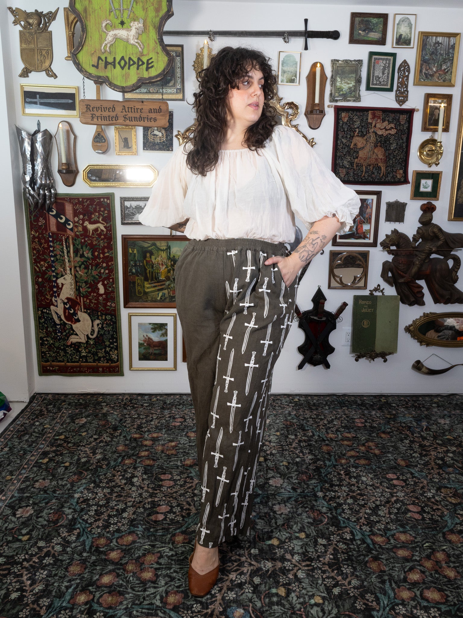 Step into medieval revival style with these bold, wide-leg pants featuring an exclusive screen-printed sword design. Made from 100% Ramie, a breathable natural fiber similar to linen, these pants offer flow and comfort for a striking silhouette.