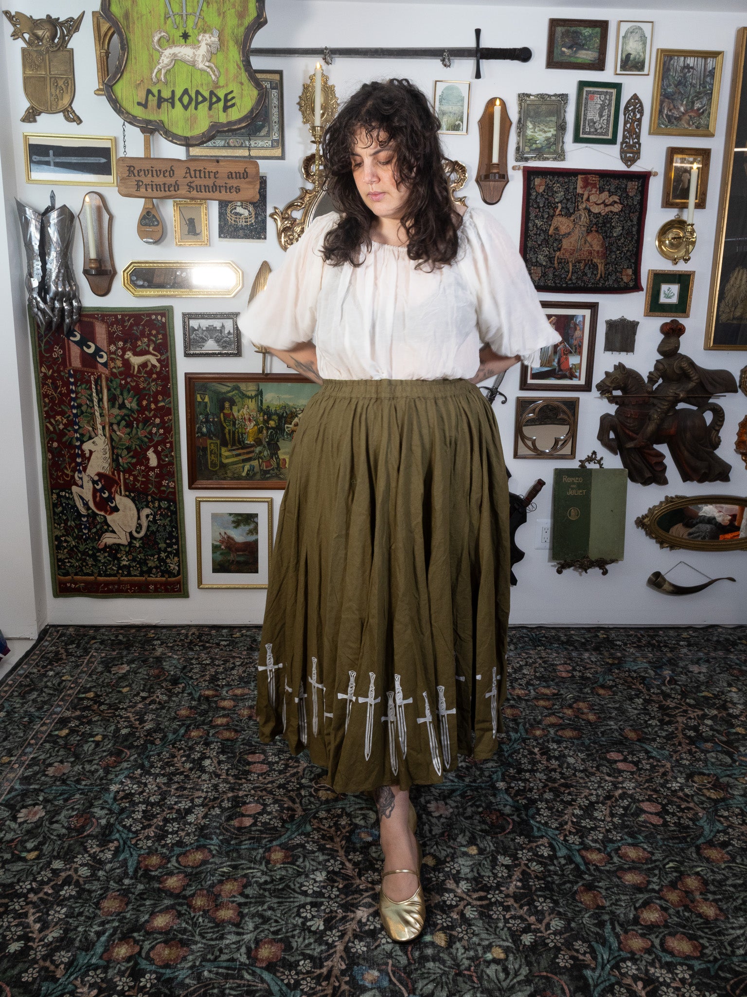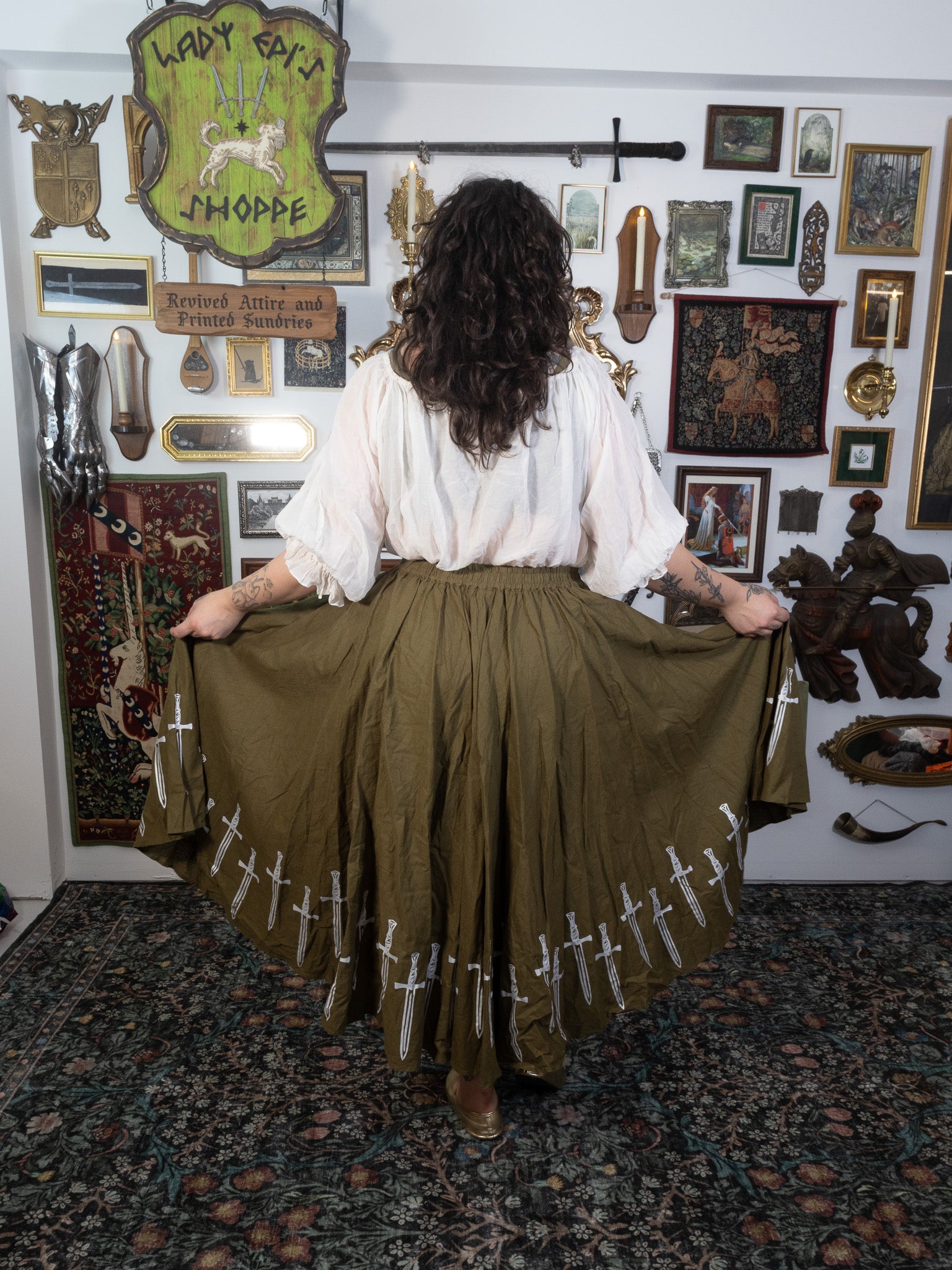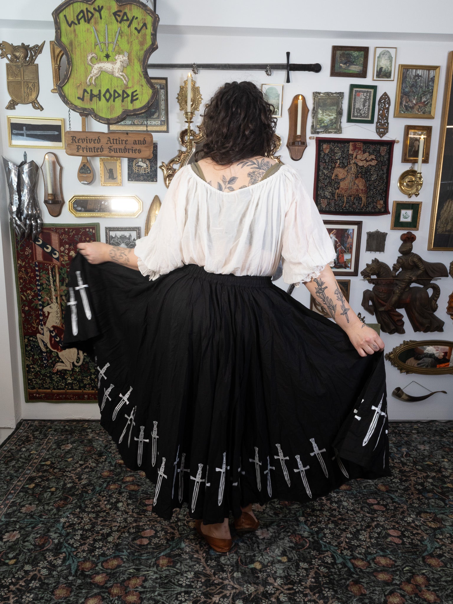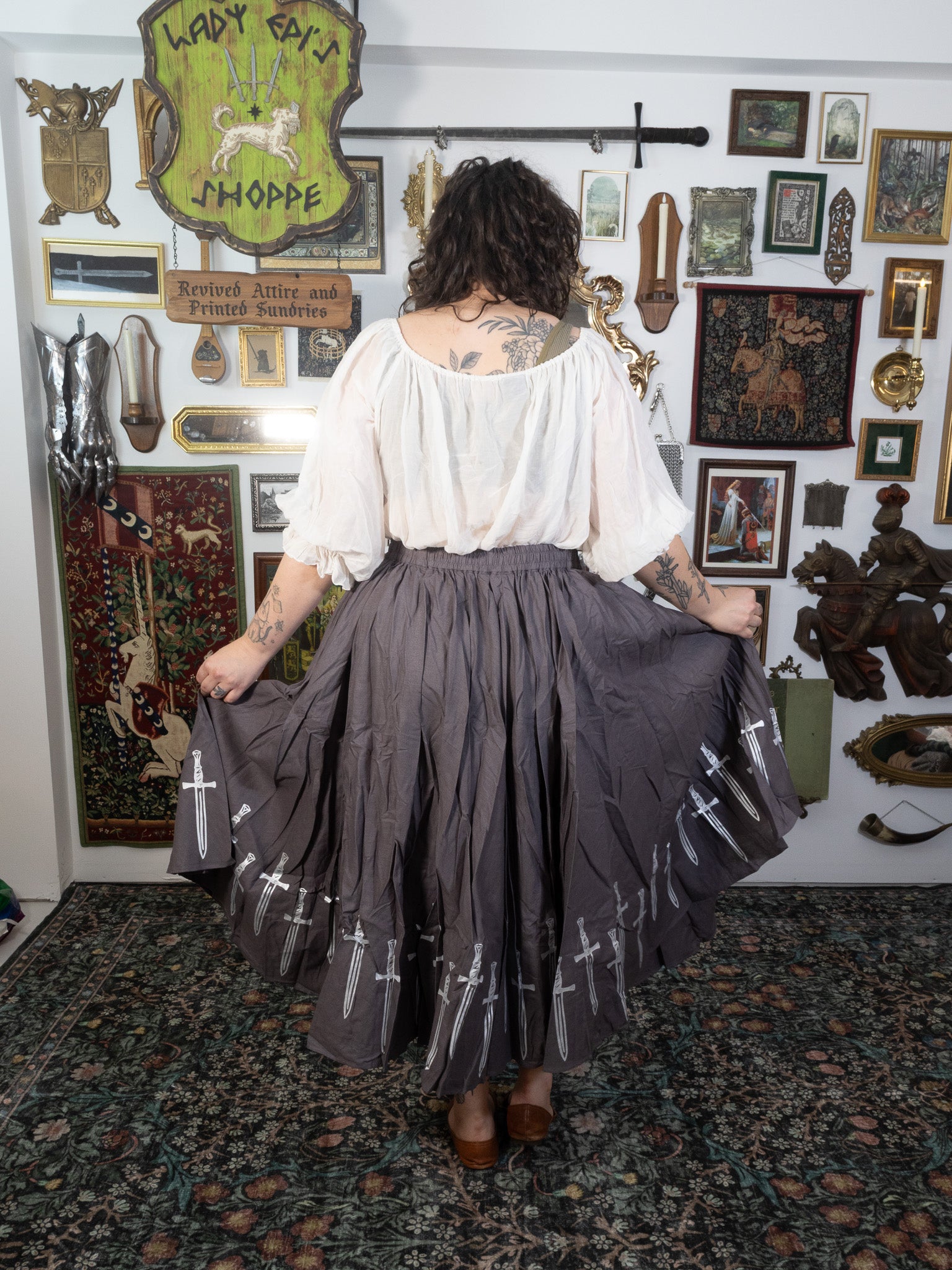 Step into medieval style with this swooshy skirt featuring a screen-printed sword design. Made from a Cotton and Linen blend, this skirt is designed to be worn as you slay your enemies.